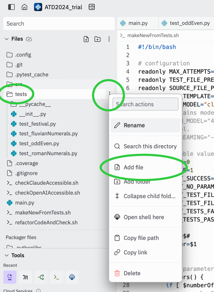 Making a file – use the context menu by the folder you want to make the file in, This is making a new file in the ./tests directory.